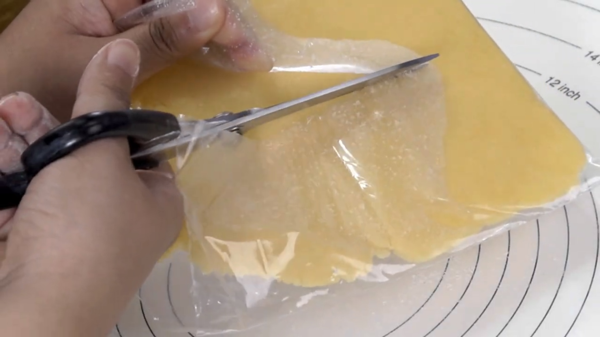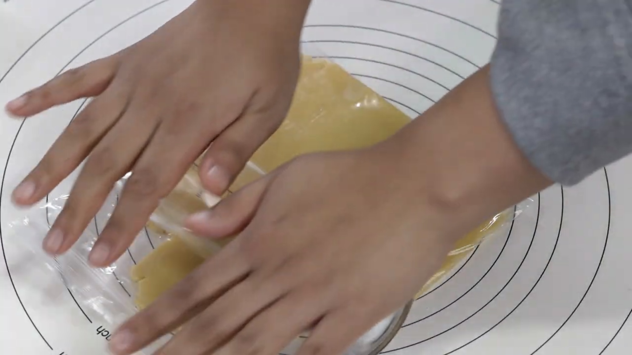 8. 비닐팩에 넣은 반죽을 밀대를 이용해 1.5cm로 밀어주세요!