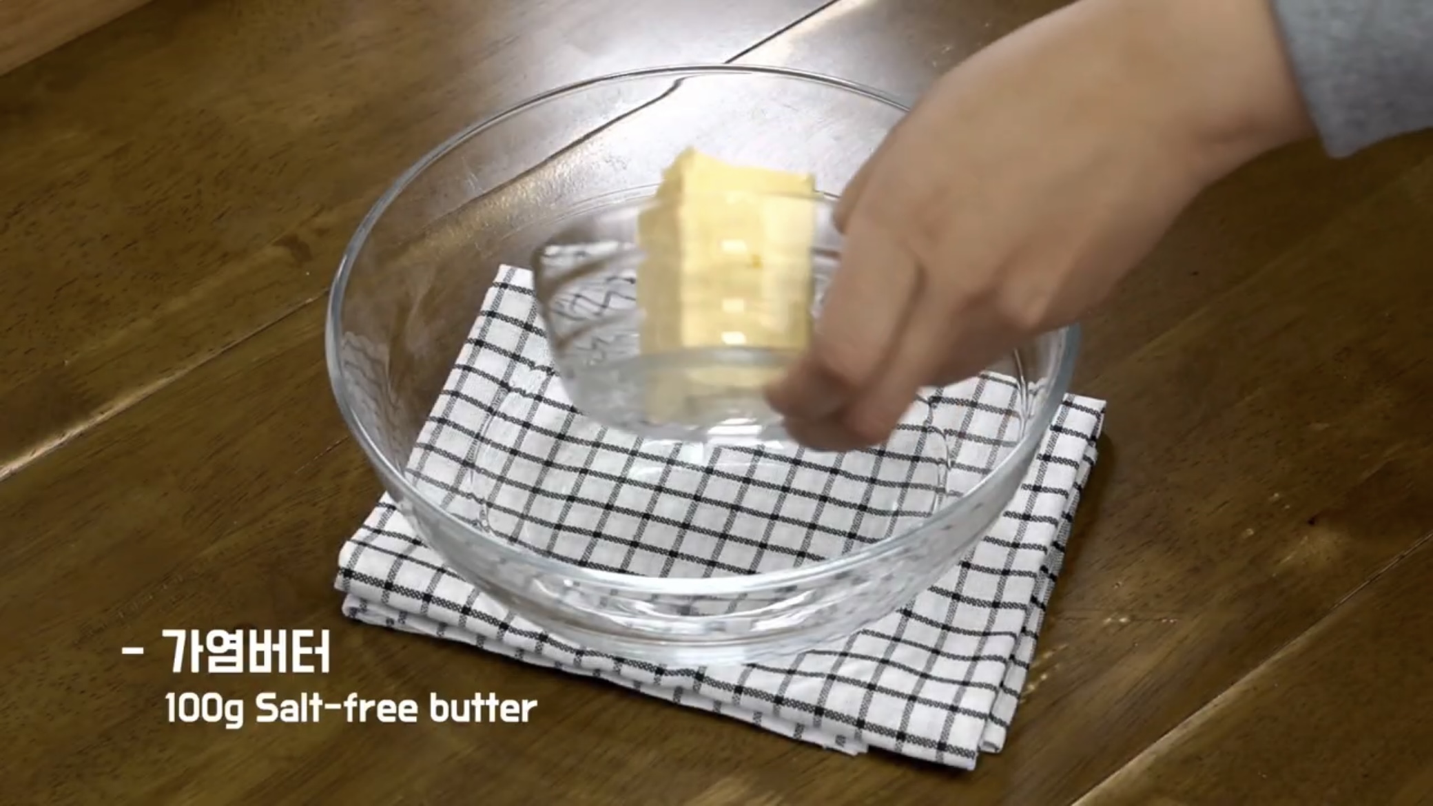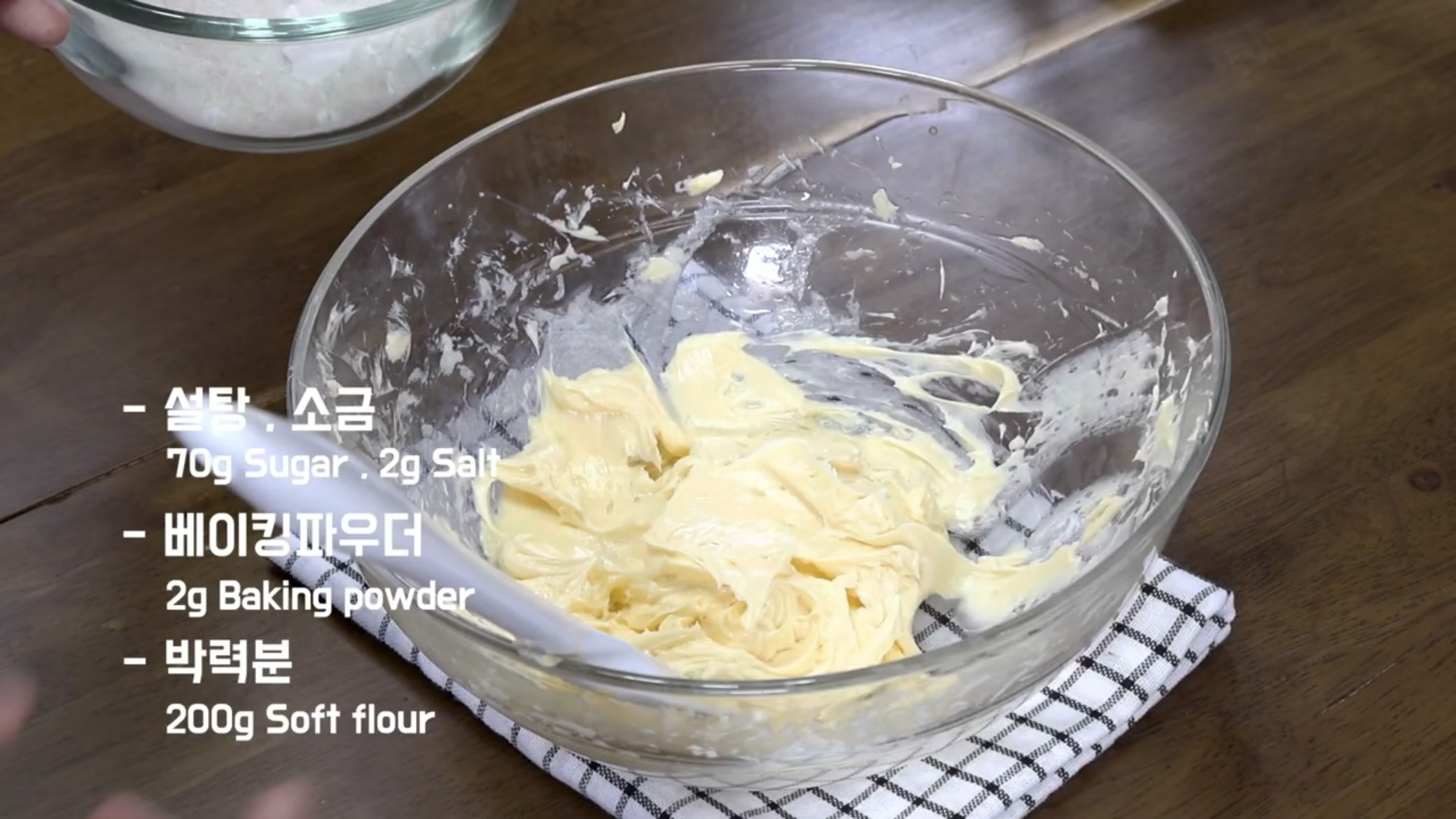 무염버터 100g, 베이킹파우더 2g, 박력분200g, 설탕70g, 달걀1개, 소금2g