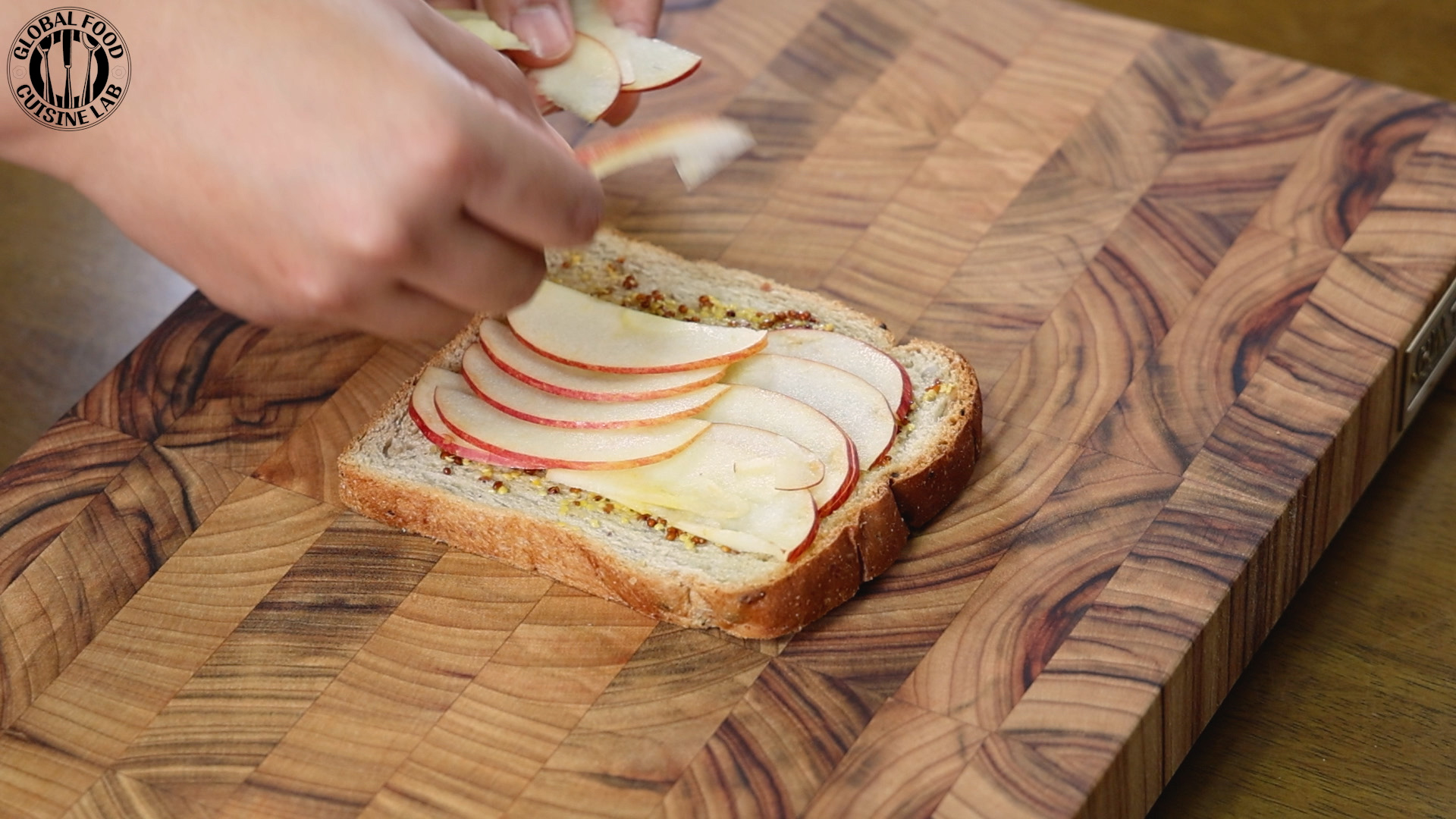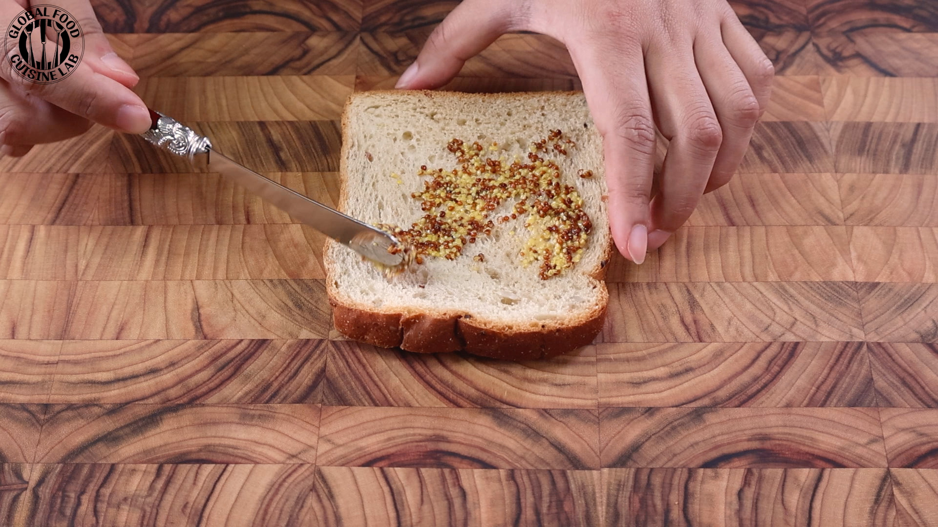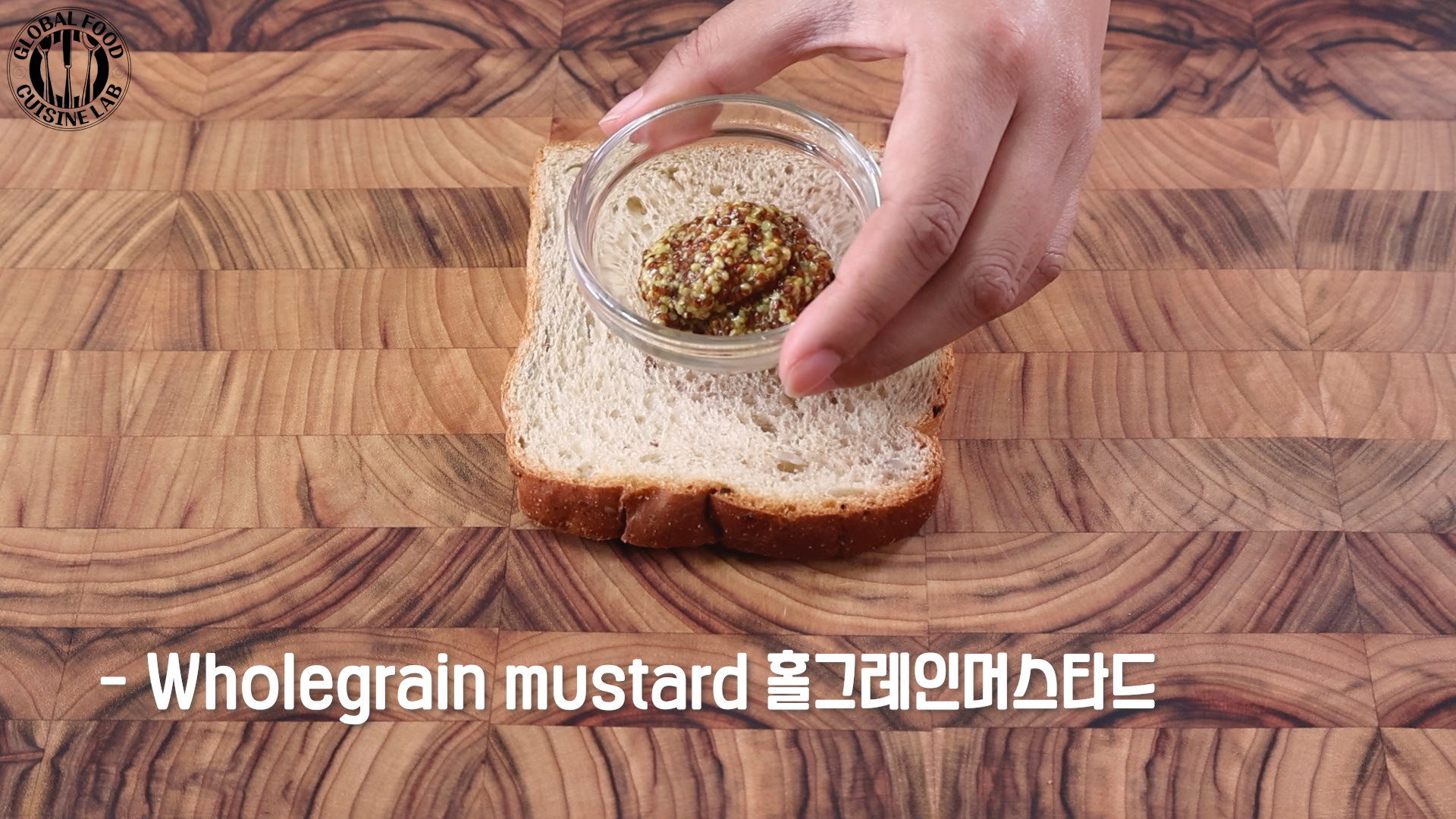 5. 빵을 미리 토스트기나 후라이팬에 약간 구워오셔서 홀그레인머스타드를 빵 표면에 얇게 펴 바릅니다.