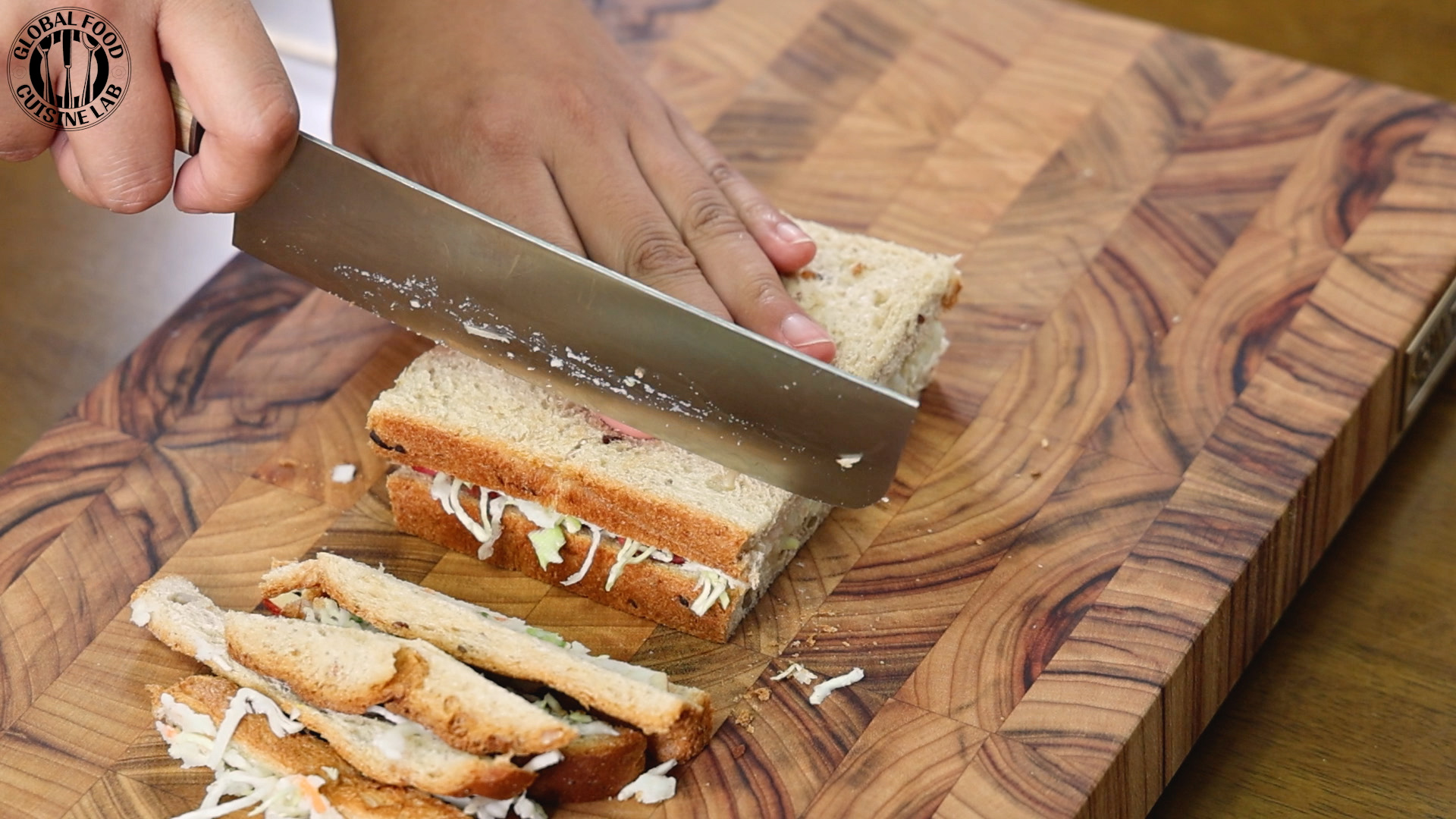 9. 샌드를 만들어 준뒤 빵의 테두리 부분을 잘라줍니다. 그냥 드셔도 전혀 상관이 없지만 저는 좀 더 부드러운 식감을 위해서 잘라 주었어요. 고소한 식감을 원하시는 분은 그냥 먹어도 정말 맛있답니다.